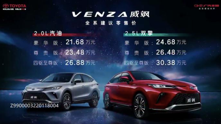 动力方面,广汽丰田VENZA威飒提供2.0L自然吸气发动机以及2.5L混合动力系统可选,其中2.0L发动机的最大功率为126kW(171马力),峰值扭矩207Nm;而2.5L阿特金森发动机的最大功率为131kW(178马力)。传动方面,前者匹配CVT变速箱;后者匹配E-CVT变速箱。