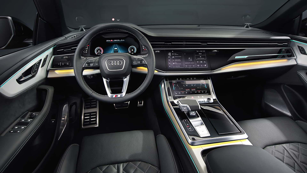 进入车内,新款奥迪Q8和SQ8的内饰并没有发生太大变化,但仍然充满了奥迪一贯的高端感。这两款车将提供多达9种装饰风格,包括各种装饰材质,如蜡木、铝制布纹或木纹等等,为消费者提供了更多的个性化选择。