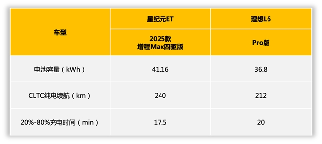 理想L6 Pro版则配备了一组36.8kWh磷酸铁锂电池,CLTC纯电续航为212km,但相比星纪元ET少了28公里续航。这一续航表现同样能够满足日常通勤需求,但相比星纪元ET略显不足。